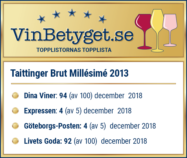 Nobelchampagne 2018: Taittinger Brut Millésimé årgång 2013, får sammanlagt högsta expertbetyg – och rankas därför på Vinbetygets topplista.