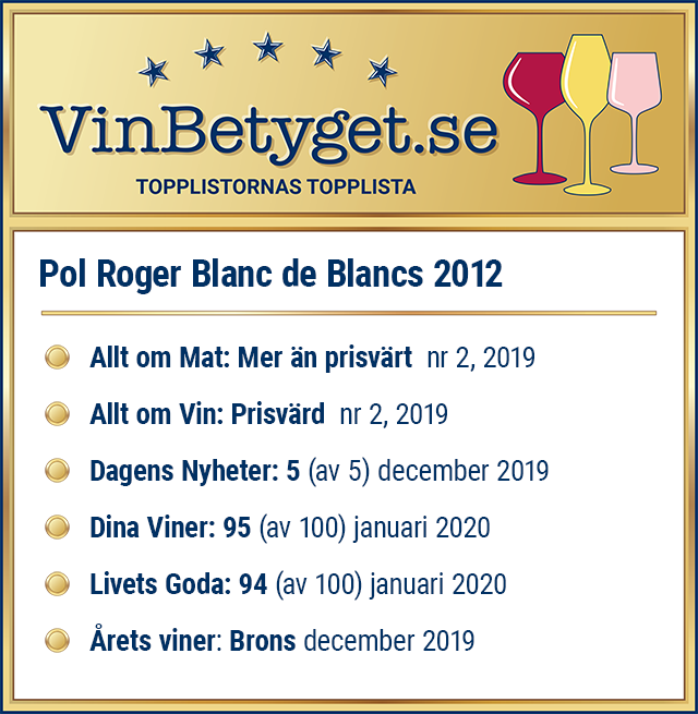 Pol Roger Blanc de Blancs, i hyllade årgången 2012, får sammanlagt höga expertbetyg – och rankas därför på VinBetygets topplista.