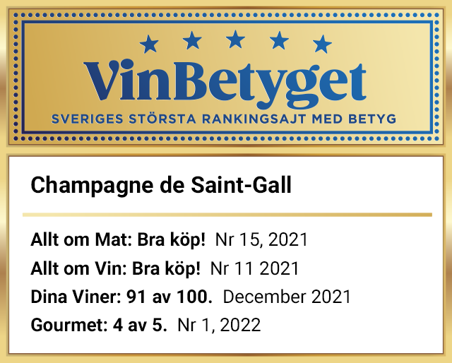 - Champagne de Saint-Gall Blanc de Blancs Grand Cru Extra Brut, får högt totalbetyg – och rankas därför på Vinbetygets topplista.