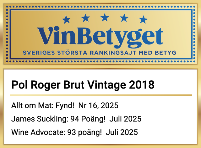 Pol Roger Vintage Brut passar till eleganta rätter av ljust kött som fågel, till fisk och skaldjur men även till aperitif.