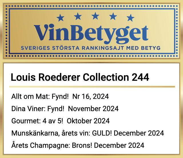 Champagnen hyllas också stort i Sverige, se alla höga betyg i vår guldruta ovan. Louis Roederer Collcetion 242 är alltså ett säkert val: Att njuta av och att ge bort som present.