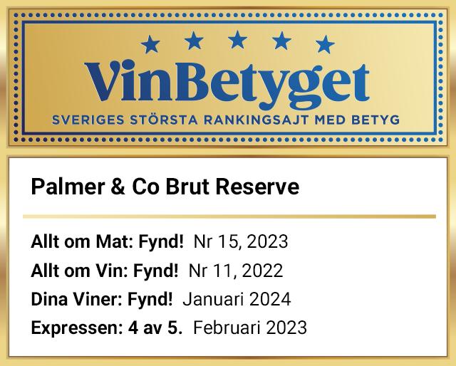 - PALMER & CO BRUT RESERVE får sammanlagt mycket höga expertbetyg – och rankas därför på Vinbetygets topplista.