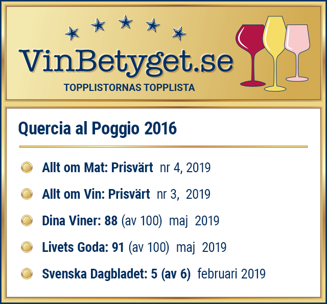 - RANKING: Alla höga betyg nedan, motiverar att Quercia al Poggio rankas på VinBetygets topplista.