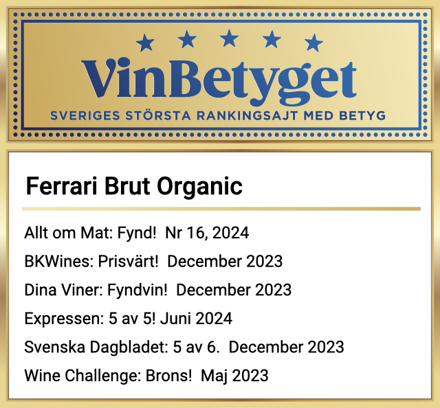 - Ferrari Brut Organic får höga expertbetyg och rankas därför på topplistan.