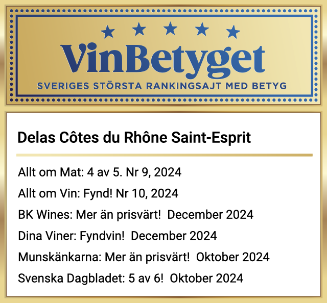 - Ranking: Delas Saint-Esprit får sammanlagt mycket höga expertbetyg – ett av de mest prisvärda vinerna av Systembolagets alla viner i priskategorin.