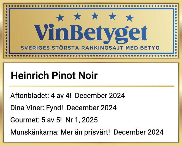 - Ranking: Heinrich Pinot Noir får höga expertbetyg och rankas på Vinbetygets topplista.Ett av de mest prisvärda vinerna av Systembolagets röda viner i prisklassen.
