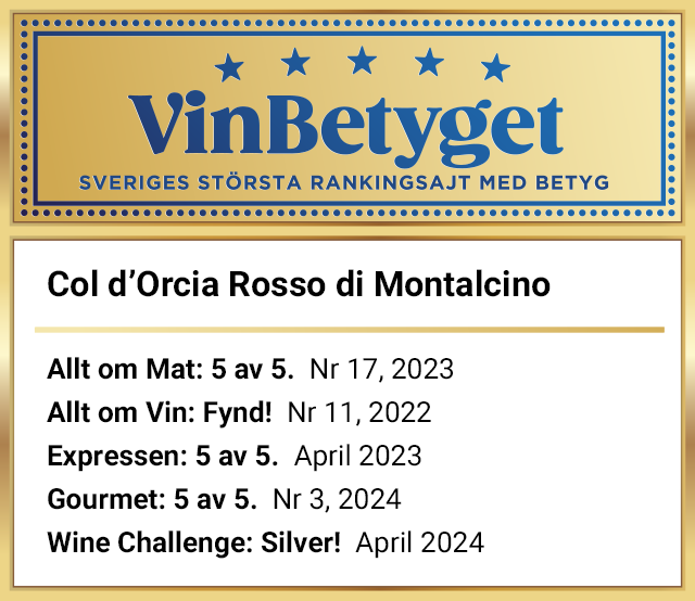 - Ranking: Col d'Orcia Rosso di Montalcino i nya årgången får mycket höga expertbetyg, vilket motiverar att Col d'Orcia Rosso di Montalcino rankas på Vinbetygets topplista.
