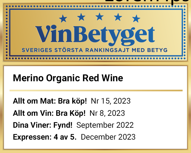 Rött vin, ekologiskt och fint medelfylligt. Rekommenderas 2025