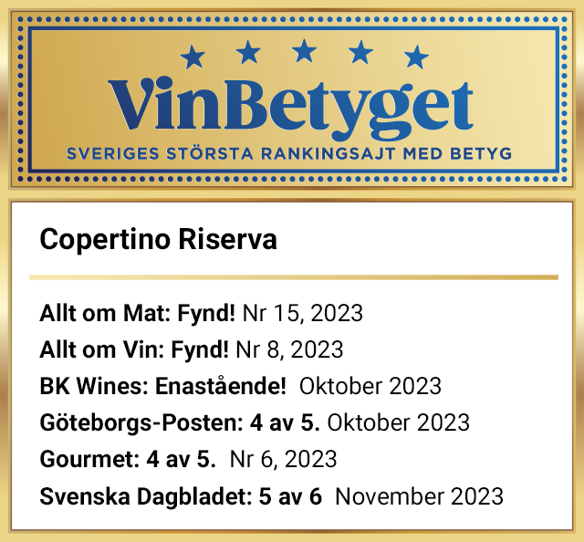 - Ranking: Copertino Riserva får sammanlagt mycket höga expertbetyg. En omtyckt och prisvärd klassiker, efterfrågas alltid på Systembolaget.