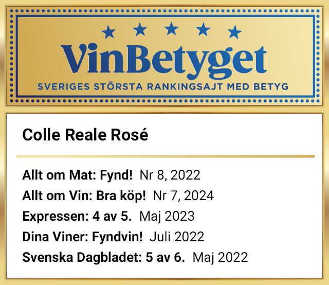 - Colle Reale Rosé, i senaste årgången, får sammanlagt högsta expertbetyg – och rankas därför på VinBetygets topplista.