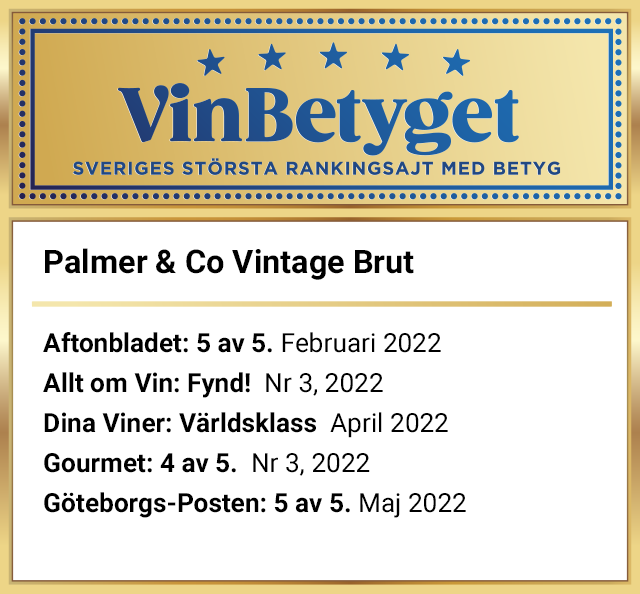 - Palmer & Co Vintage Brut i toppårgången 2015 får sammanlagt mycket höga expertbetyg.