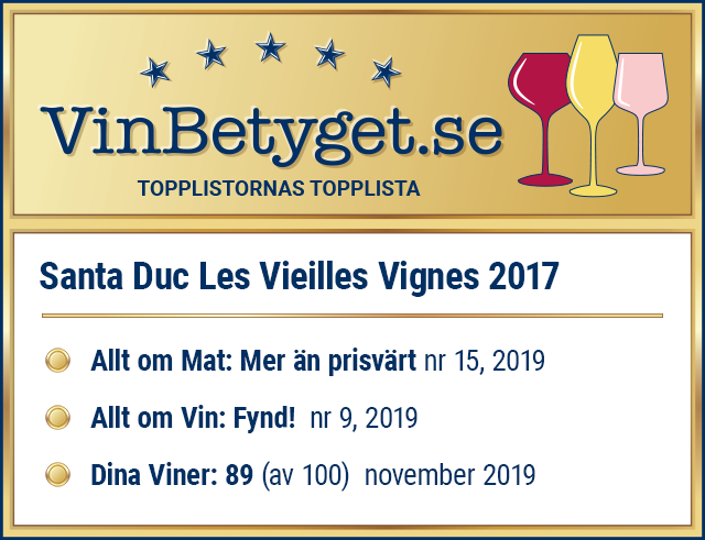 Santa Duc Côtes du Rhône Les Vieilles Vignes, årgång 2016, får silver av Allt om Vins särskilda jury med kunniga vinjournalister och provare.