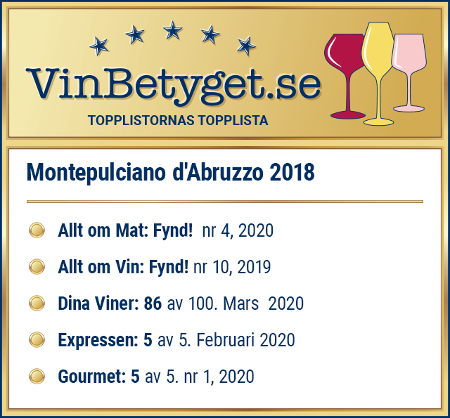 - Montepulciano d'Abruzzo årgång 2018, får höga expertbetyg.