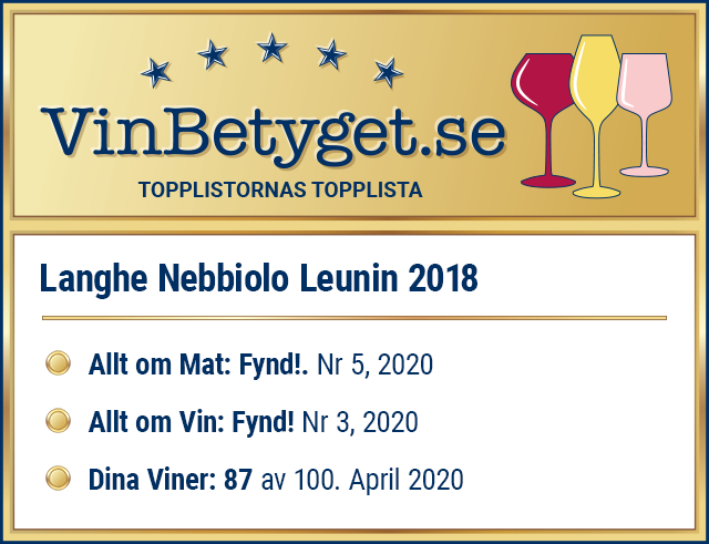 - LANGHE NEBBIOLO LEUNIN, årgång 2018, får sammanlagt mycket höga expertbetyg.