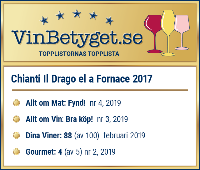 Chianti Il Drago el a Fornace, årgång får sammanlagt mycket höga expertbetyg – och rankas därför på VinBetygets topplista. Det är absolut ett av de mest prisvärda vinerna av Systembolagets alla 286 viner i priskategorin.