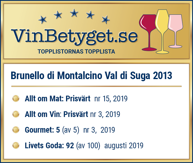 Brunello di Montalcino Val di Suga i årgång 2013, får sammanlagt mycket höga expertbetyg – och vilket ger en placering på VinBetygets topplista Bästa Röda vinerna över 200 kr. Det är ett av de mest prisvärda röda vinerna av Systembolagets alla viner i den övre prisklassen, fasta sortimentet.