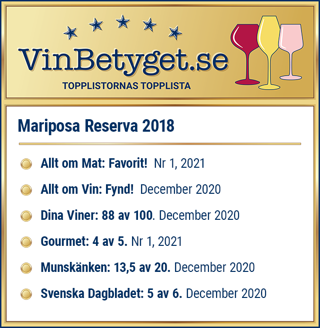 - Mariposa Reserva är ett av de mest prisvärda, av Systembolagets 94 röda viner i denna priskategori.