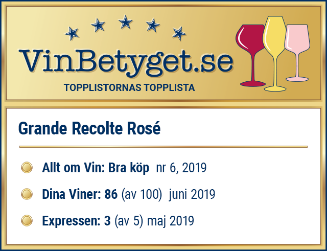 Grand Recolte Rosé,i nya årgångenfår sammanlagt mycket höga expertbetyg – och rankas därför på VinBetygets topplista. Det är absolut ett av de mest prisvärda rosevinerna av Systembolagets roséviner, i ordinarie sortimentet. Se Guldrutan nedan med alla aktuella expertbetyg för Grand Recolte Rosé: