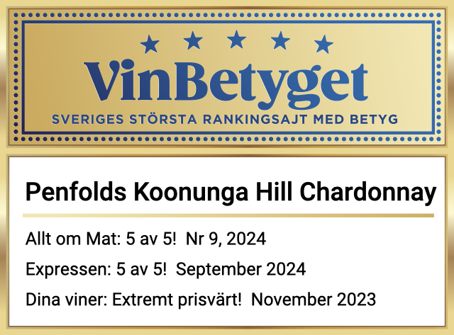 - Ranking: Penfolds Koonunga Hill Chardonnay får sammanlagt mycket höga expertbetyg. Vinet tillhör det yppersta toppskiktet av Systembolagets vita viner i priskategorin.